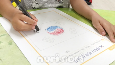 태극기의 모양에 관심을 갖고, 태극기를 보며 색을 따라 칠해 봅니다.