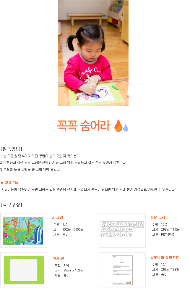 - 본 교구를 활용하여 병원과 약국에서 일어날 수 있는 일을 경험해보는 역할놀이 활동 뿐 아니라, 처방전에 맞는 알약을 찾아 일대일 대응을 경험하는 수조작 영역의 교구로 활용할 수 있습니다.